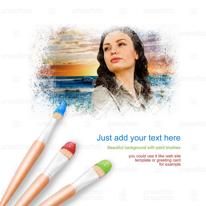 Белый фон с тремя кистями и портрет красивой молодой женщины на свежем воздухе
