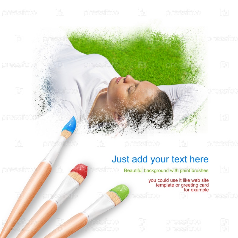 Белый фон с тремя кистями для рисования, портрет красивой молодой женщины на открытом воздухе