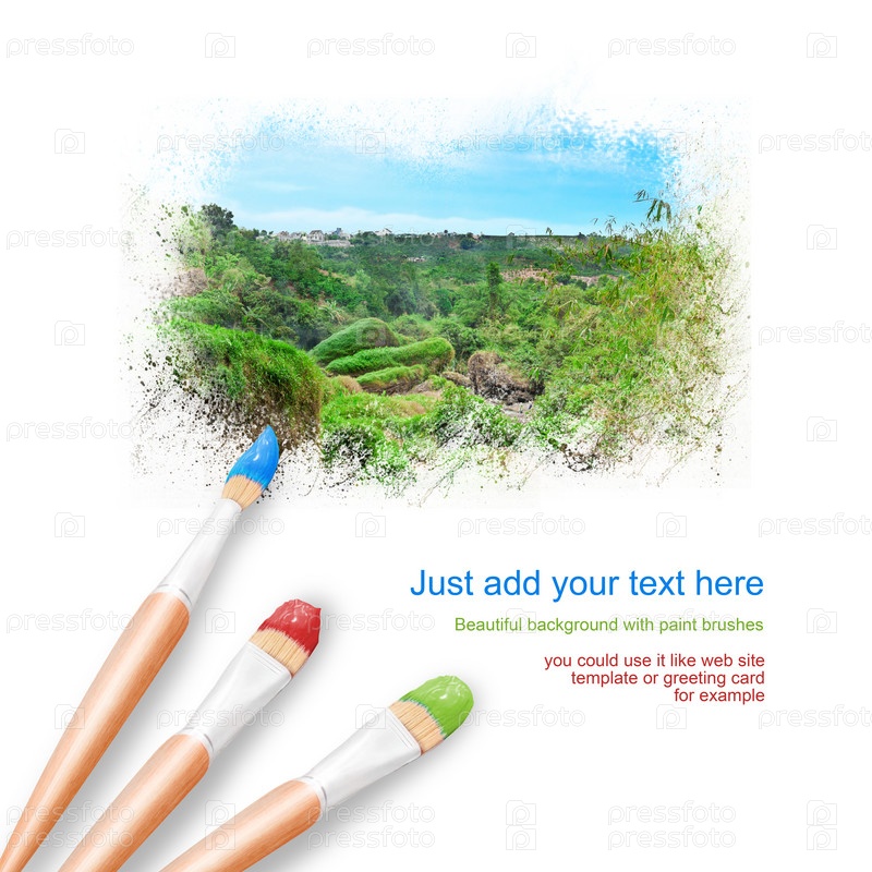 Белый фон с тремя кистями для рисования, красивый пейзаж