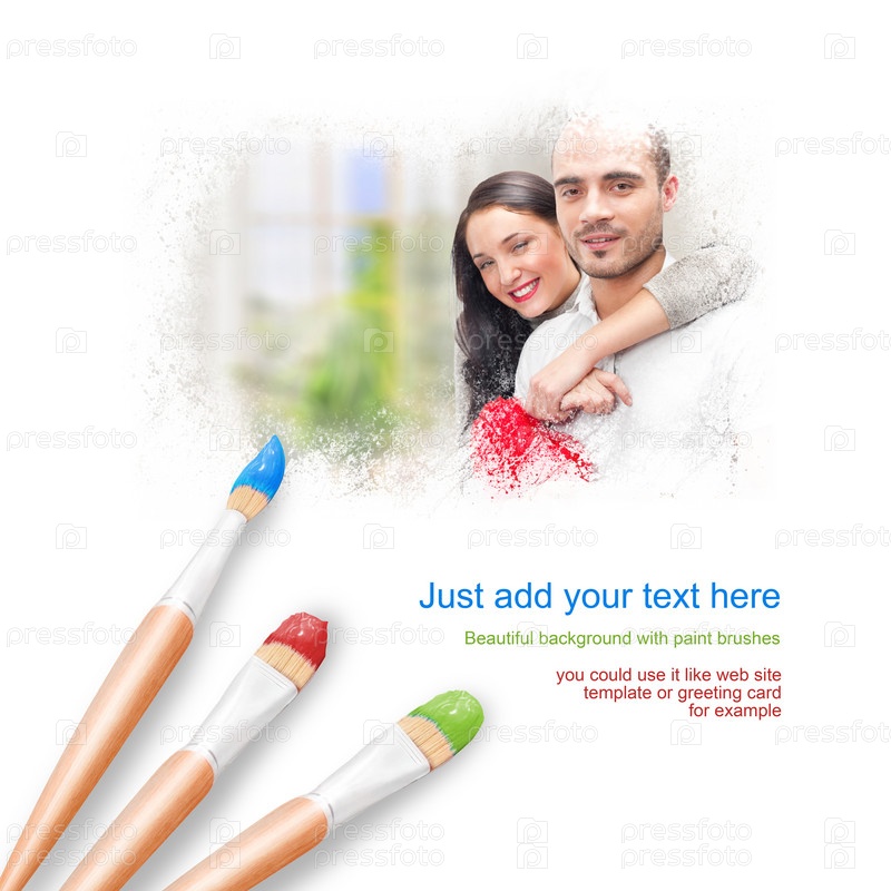 Белый фон с тремя кистями для рисования, портрет красивой молодой пары