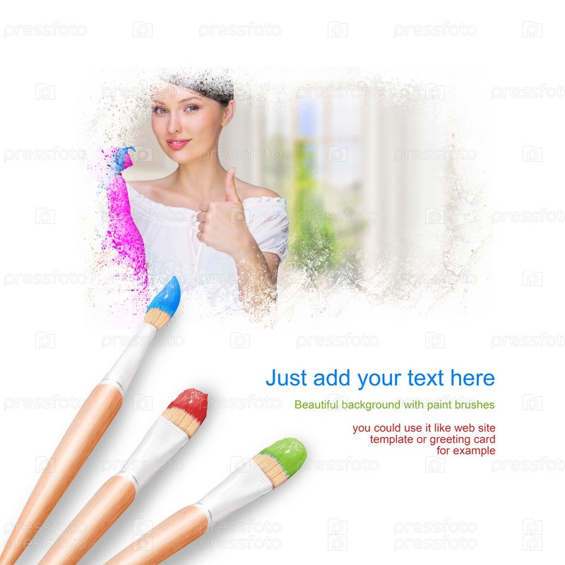 Белый фон с тремя кистями для рисования, молодая женщина готовится к праздничной вечеринке