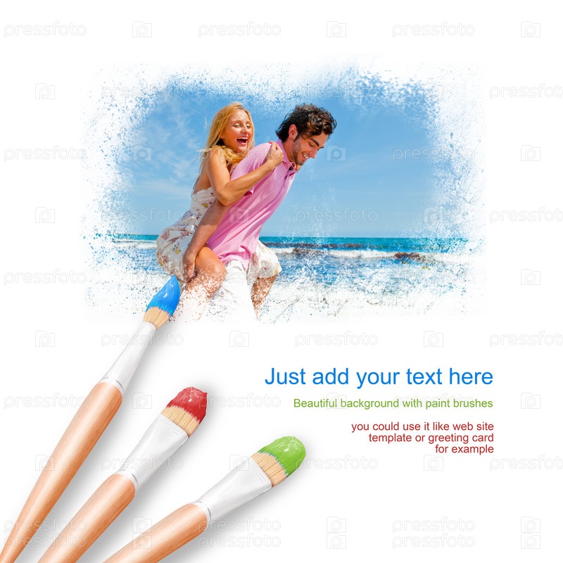 Белый фон с тремя кистями для рисования, красивая молодая пара обнимается на пляже