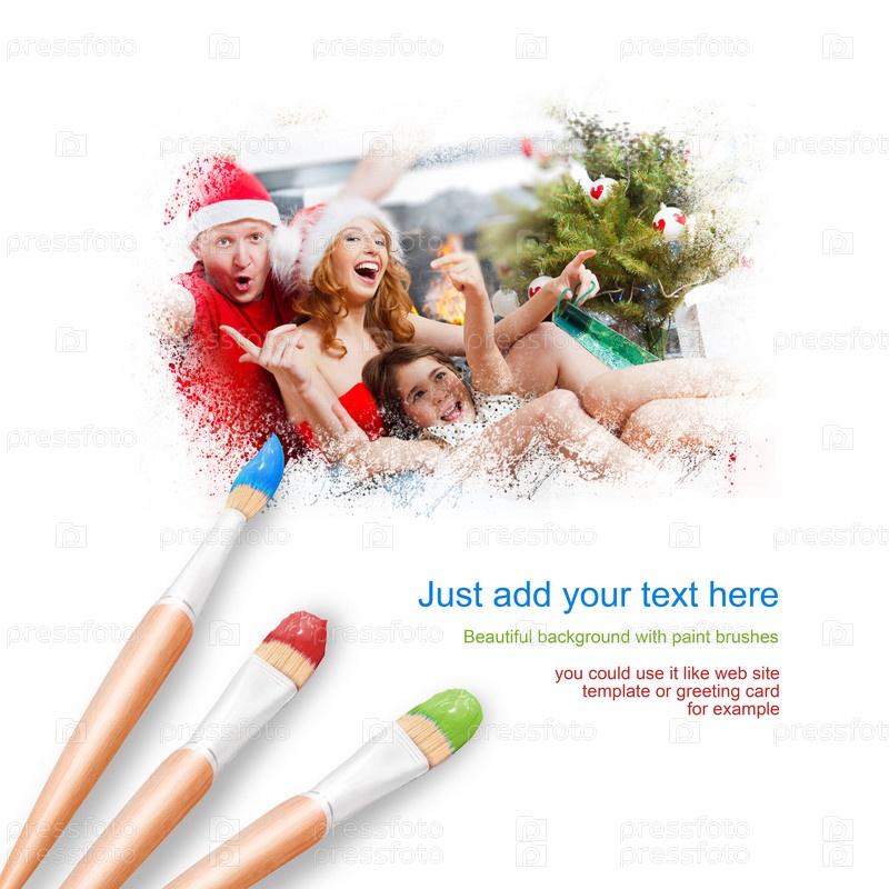 Белый фон с тремя кистями для рисования, портрет счастливой семьи, отмечающей Рождество