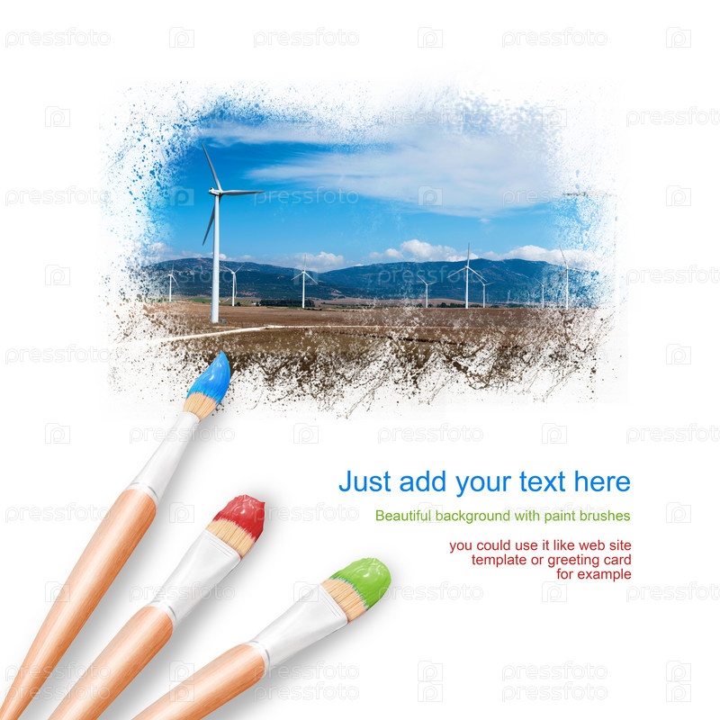 Белый фон с тремя кистями и ветряными турбинами. Концепция экологической электроэнергетики