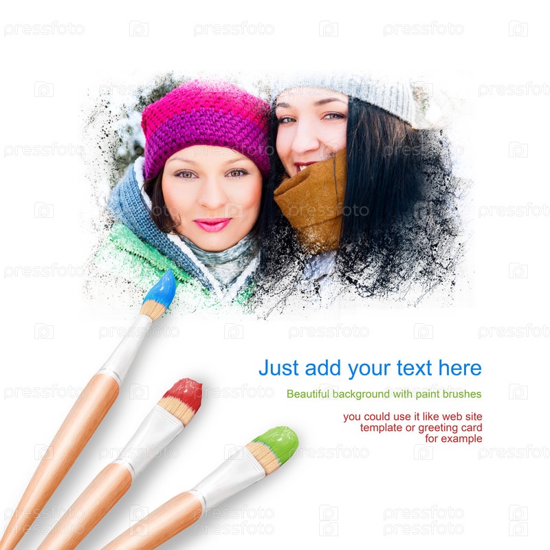 Белый фон с тремя кистями и зимний портрет двух красивых молодых женщин