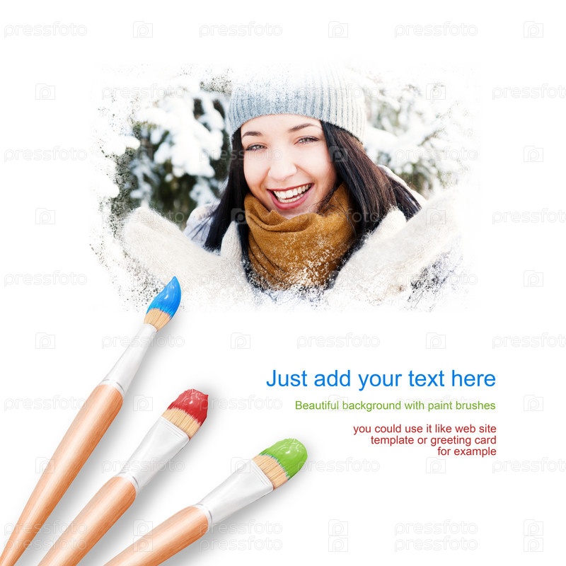 Белый фон с тремя кистями и зимний портрет красивой молодой женщины на свежем воздухе