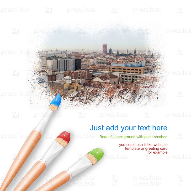 Белый фон с тремя кистями и прекрасным видом города Мадрид, Испания