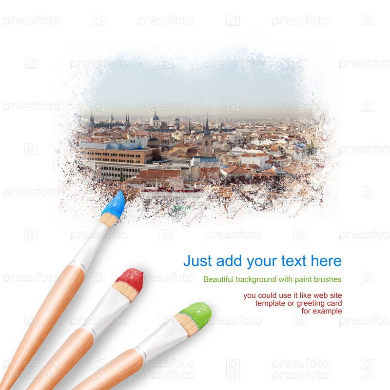 Белый фон с тремя кистями и прекрасным видом города Мадрид, Испания