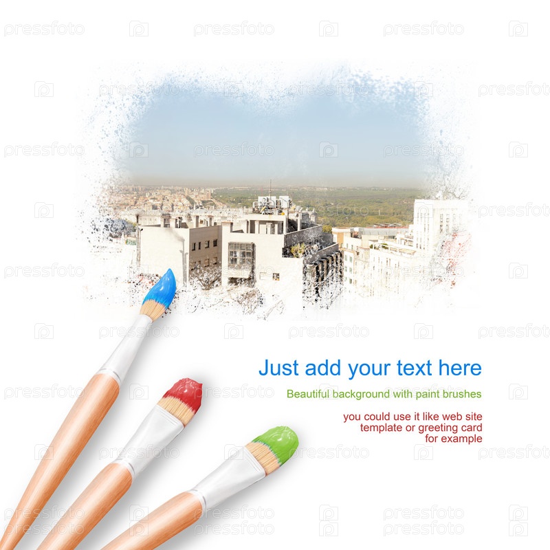Белый фон с тремя кистями и прекрасным видом города Мадрид, Испания