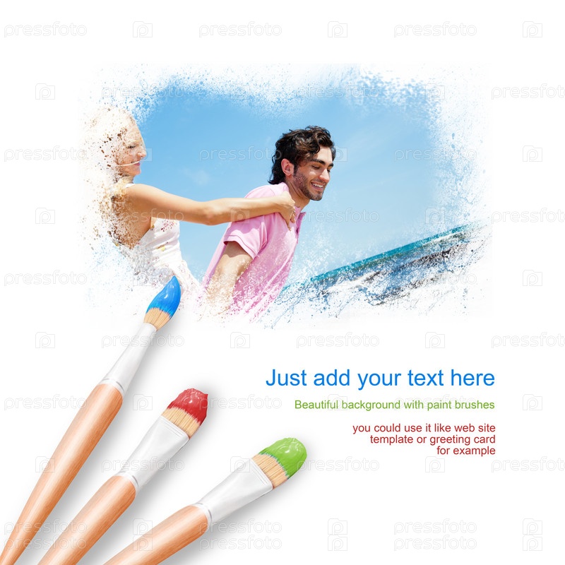 Белый фон с тремя кистями и портрет красивойя молодой пары, обнимающейся на пляже