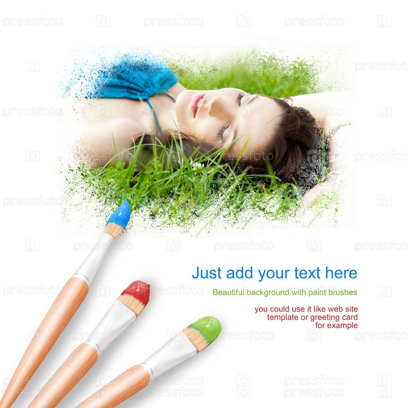 Белый фон с тремя кистями для рисования, портрет красивой молодой женщины на открытом воздухе, лежащей на траве