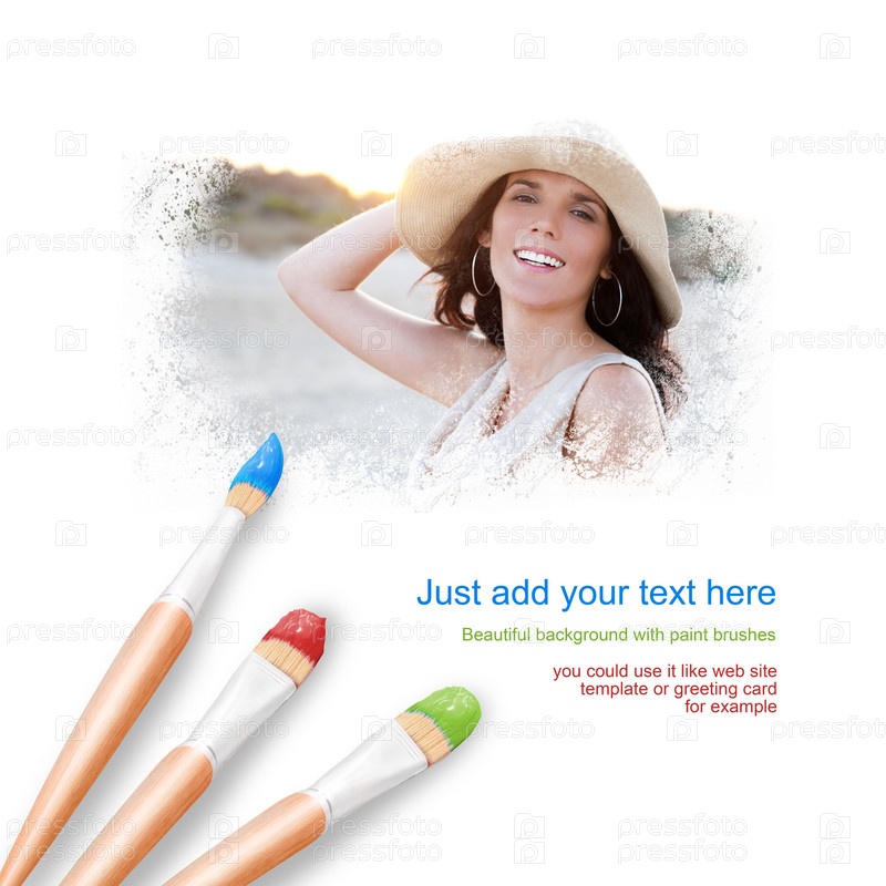 Белый фон с тремя кистями для рисования, портрет красивой молодой женщины на открытом воздухе