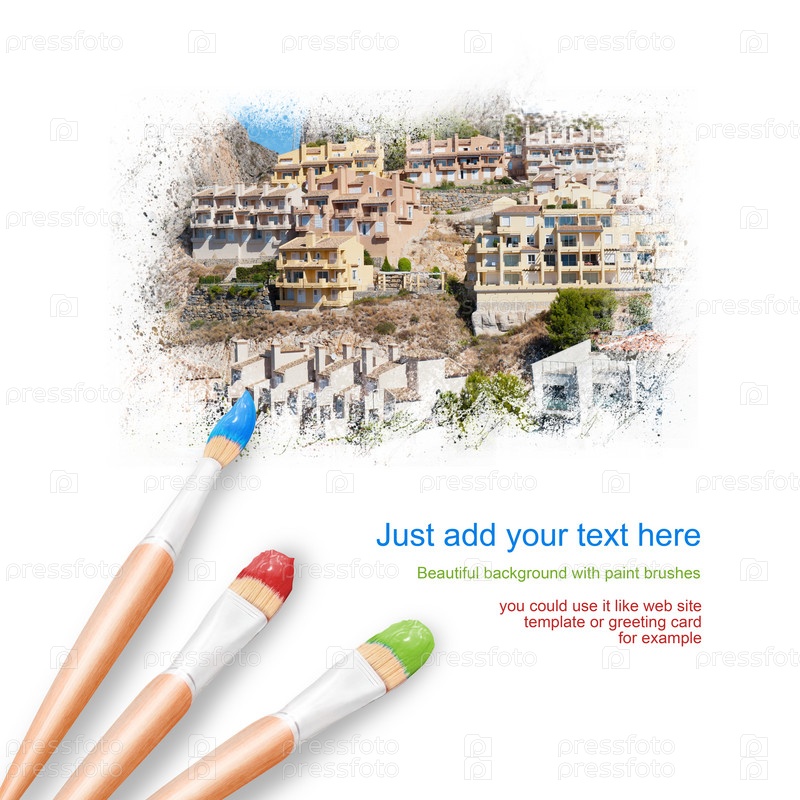 Белый фон с тремя кистями для рисования, красивые здания. Ипотека