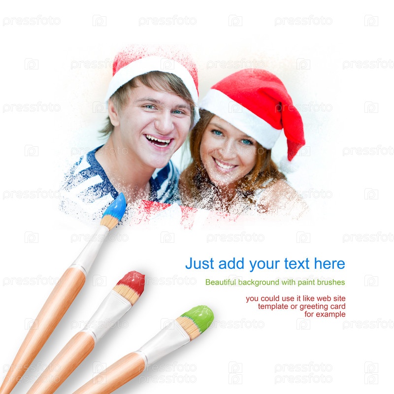 Белый фон с тремя кистями и портрет молодой пары в новогодних шапках