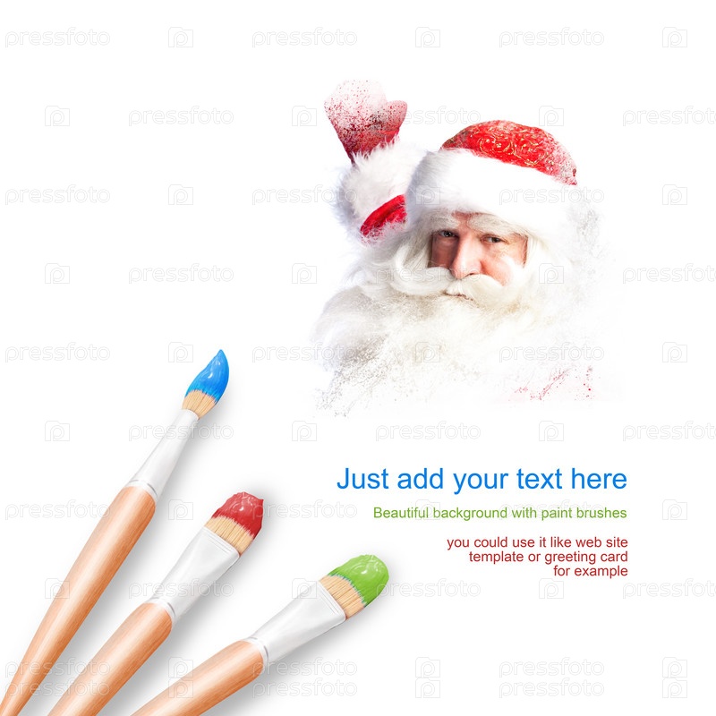 Белый фон с тремя кистями и портрет улыбающегося Санта-Клауса