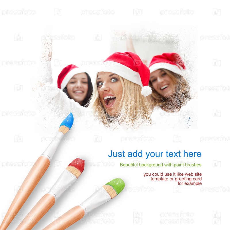 Белый фон с тремя кистями и портрет трех красивых девушек в новогодних колпаках с подарками