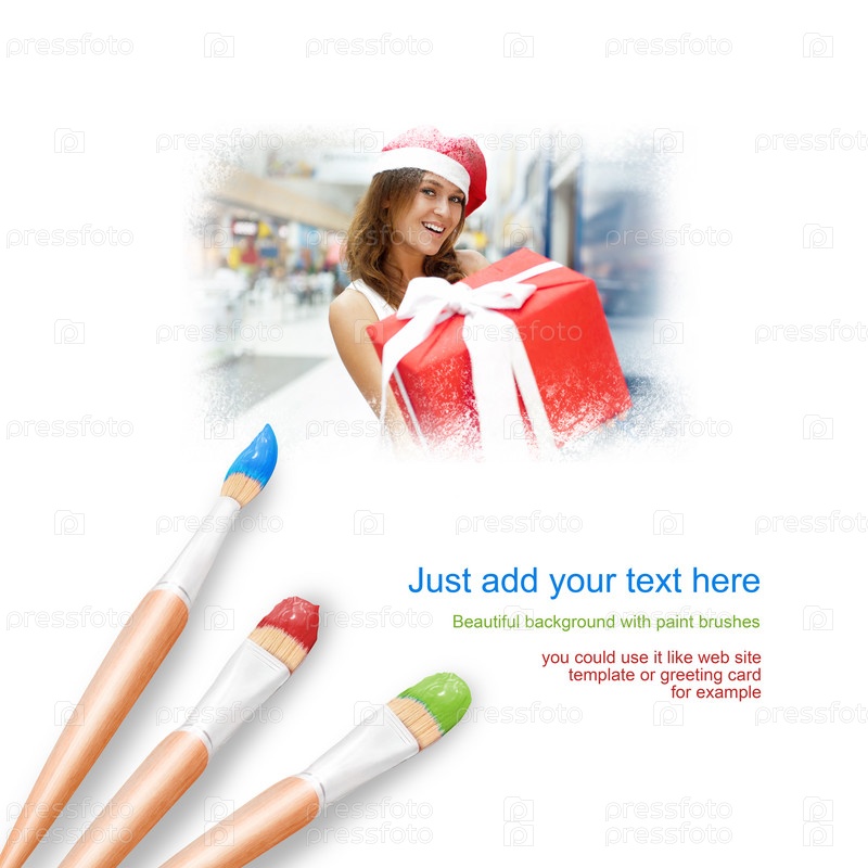 Белый фон с тремя кистями и портрет трех красивой девушки в новогоднем колпаке с подарками