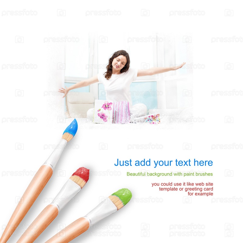Белый фон с тремя кистями и портрет девушки, готовящейся к вечеринке
