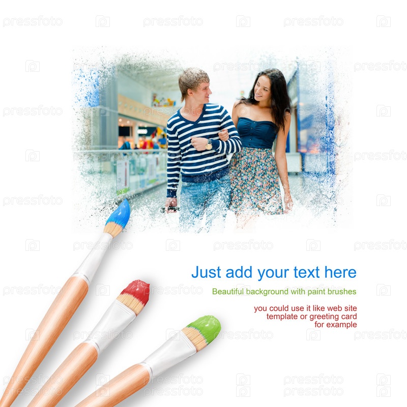 Белый фон с тремя кистями и портрет молодой пары в торговом центре