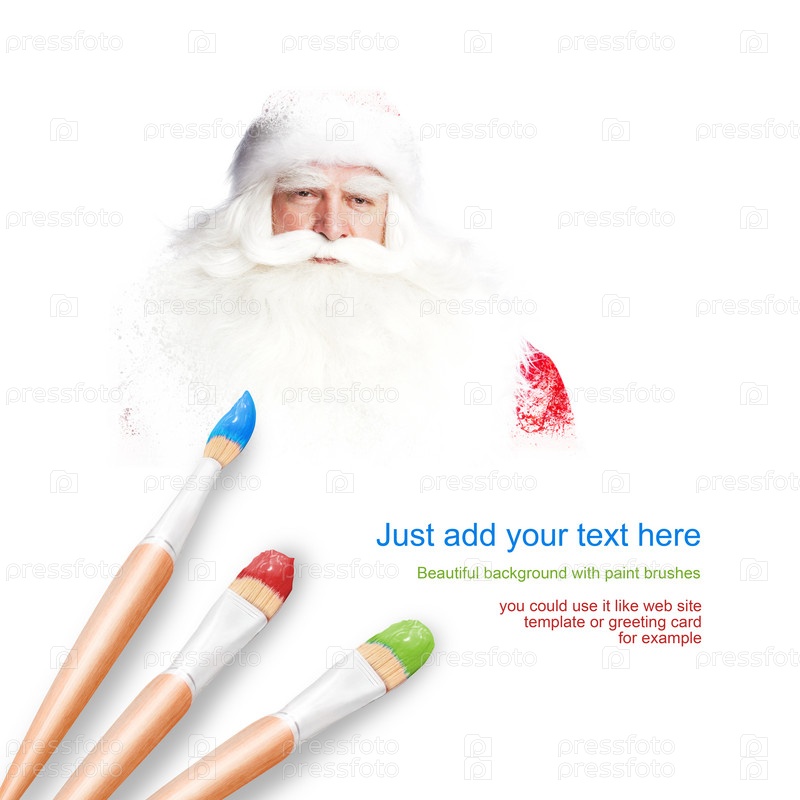 Белый фон с тремя кистями и портрет улыбающегося Санта-Клауса