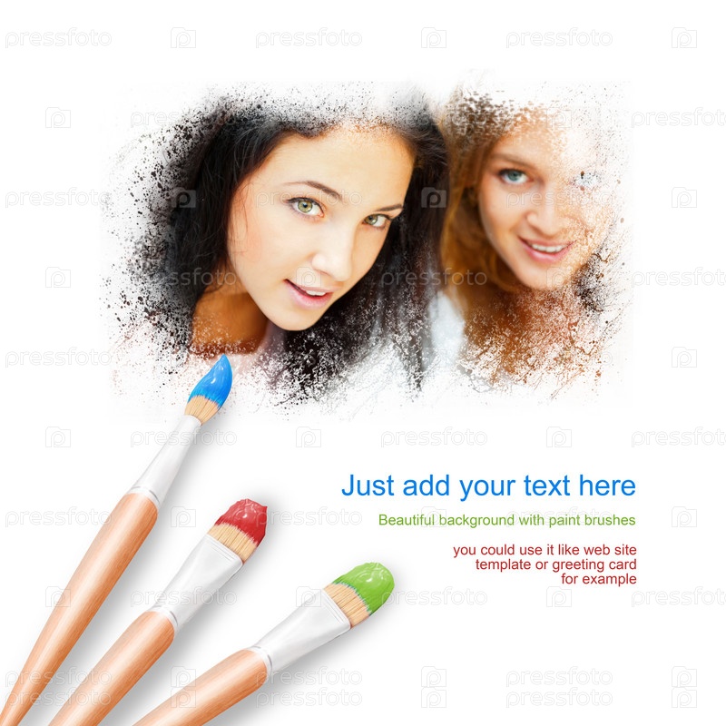 Белый фон с тремя кистями для рисования, портрет двух красивых молодых женщин