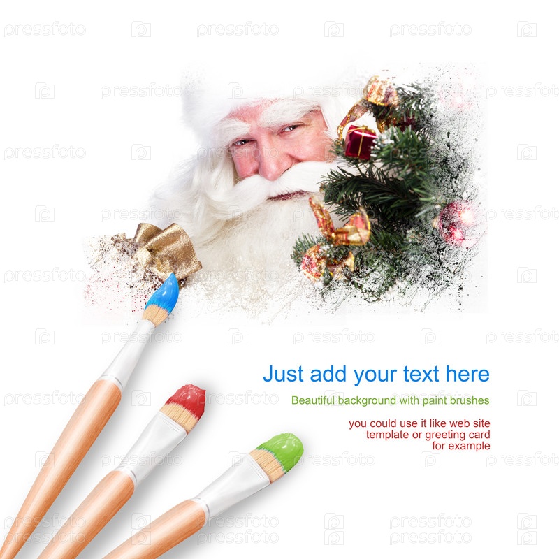 Белый фон и три кисти для рисования, портрет улыбающегося Санта-Клауса