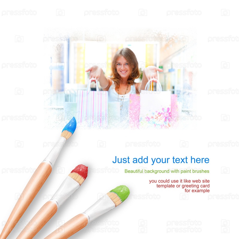 Белый фон с тремя кистями для рисования, молодая женщина с сумками