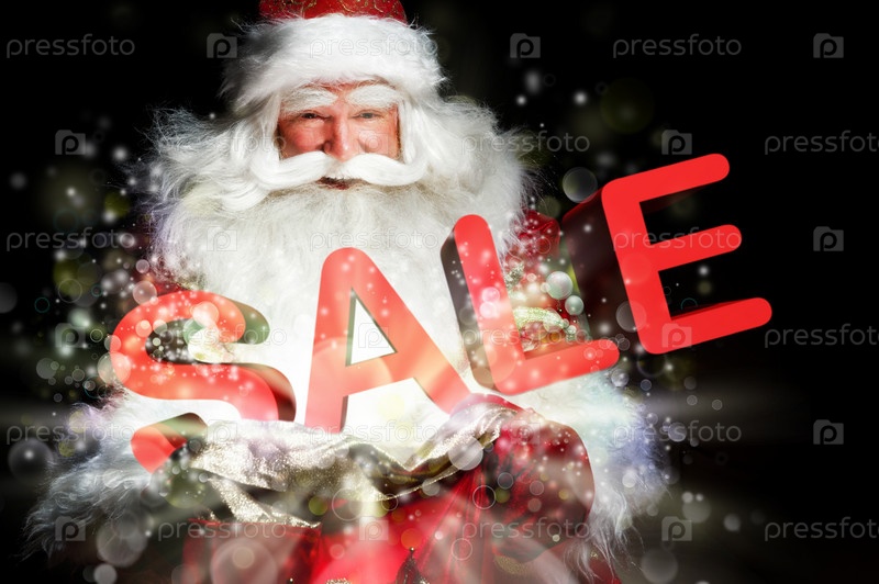 Санта-Клаус держит мешок и улыбается. Огни и искры летят из мешка. Знак распродажи