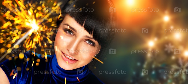 Портрет молодой привлекательной женщины, держащей бенгальский огонь