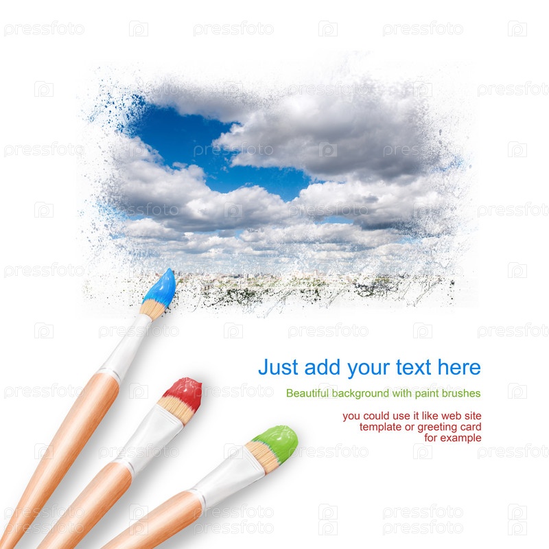 Белый фон с тремя кистями и голубое небо с облаками