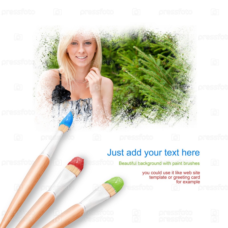 Белый фон с тремя кистями и портрет красивой молодой женщины на свежем воздухе