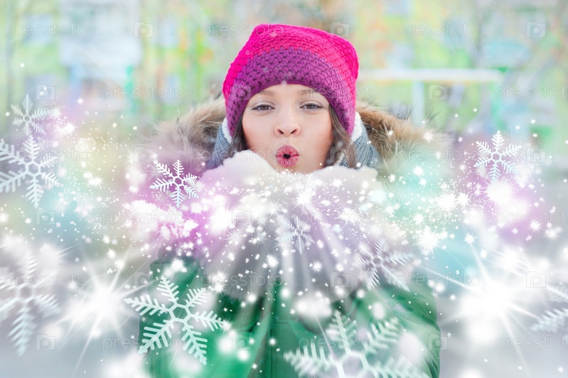 Рождественская девушка дует снег с ладоней. Вид спереди