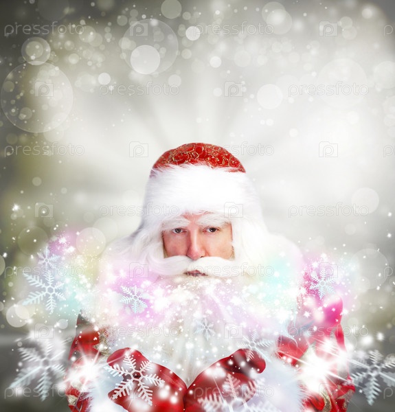 Новогодняя тема: Санта-Клаус дует снежинки с рук. Дизайн плаката
