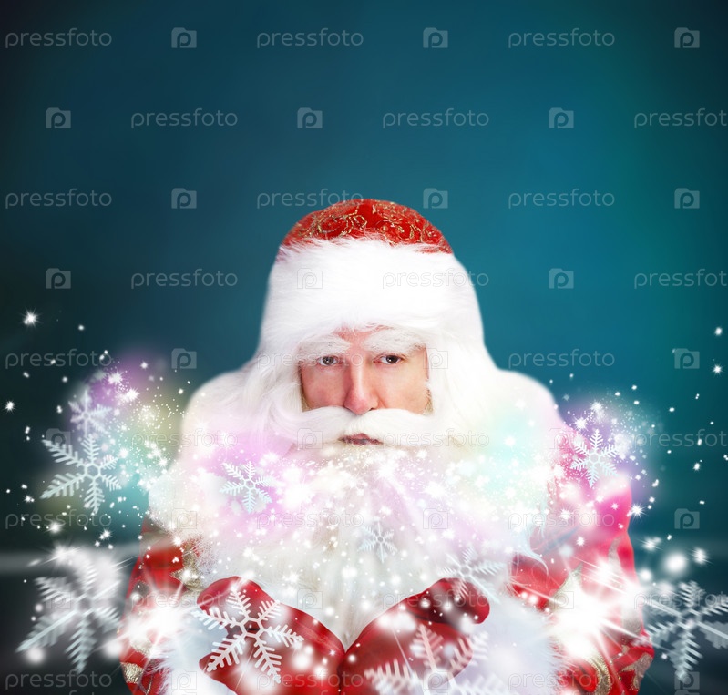 Новогодняя тема: Санта-Клаус дует снежинки с рук. Дизайн плаката