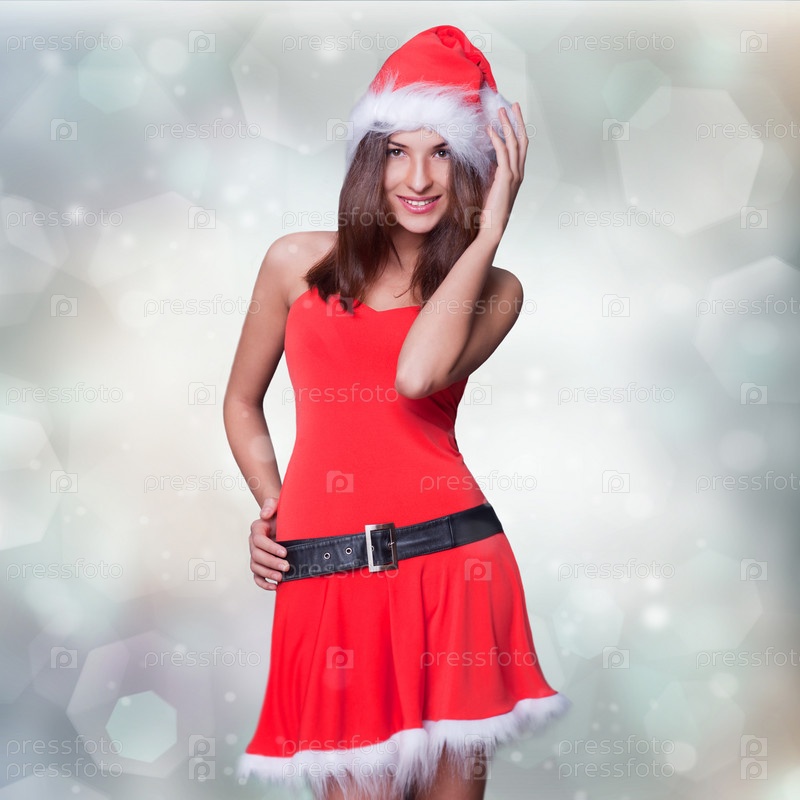 Красивая женщина 20-25 лет в рождественском платье позирует на сером фоне