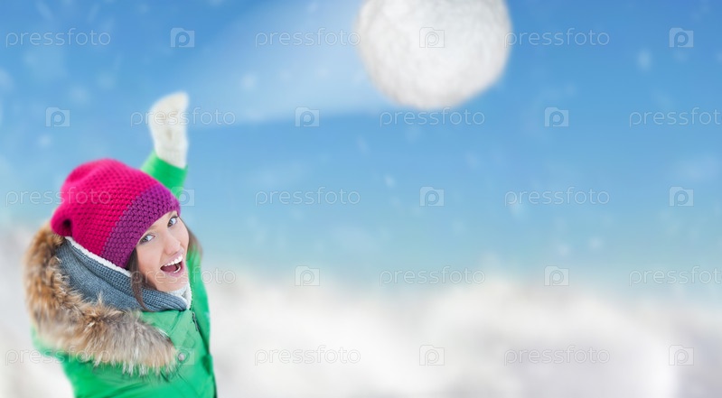 Молодая женщина бросает снежок. Зимние забавы