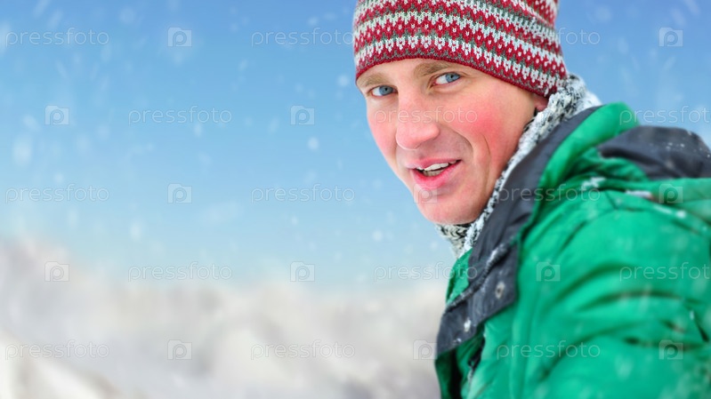 Довольный улыбающийся мужчина в зеленой куртке на свежем воздухе