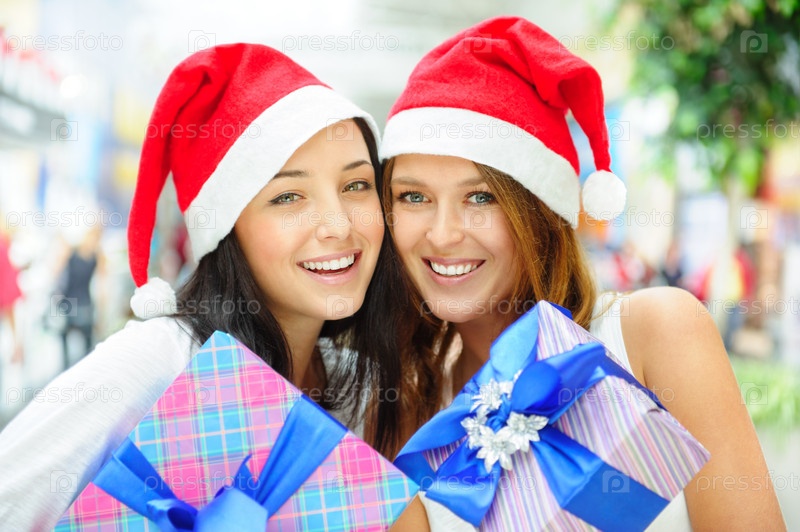 Счастливые девушки в рождественских шапках стоят в помещении и держит подарочные коробки