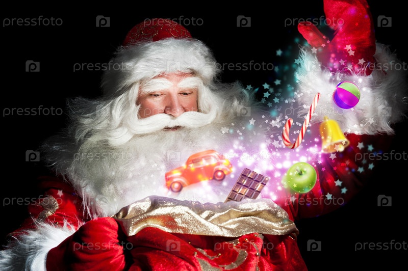 Санта-Клаус достает подарки и конфеты из мешка и творит чудеса