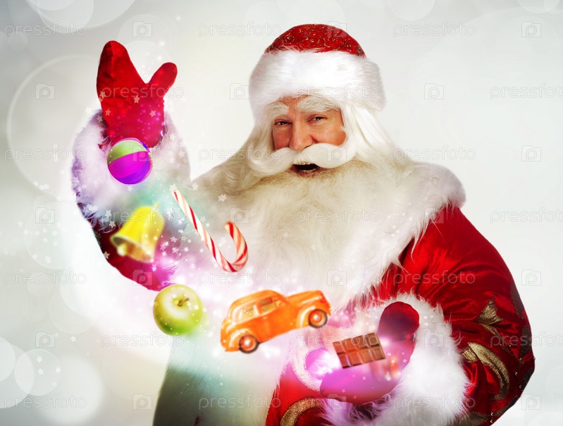 Санта-Клаус достает подарки и конфеты из мешка и творит чудеса
