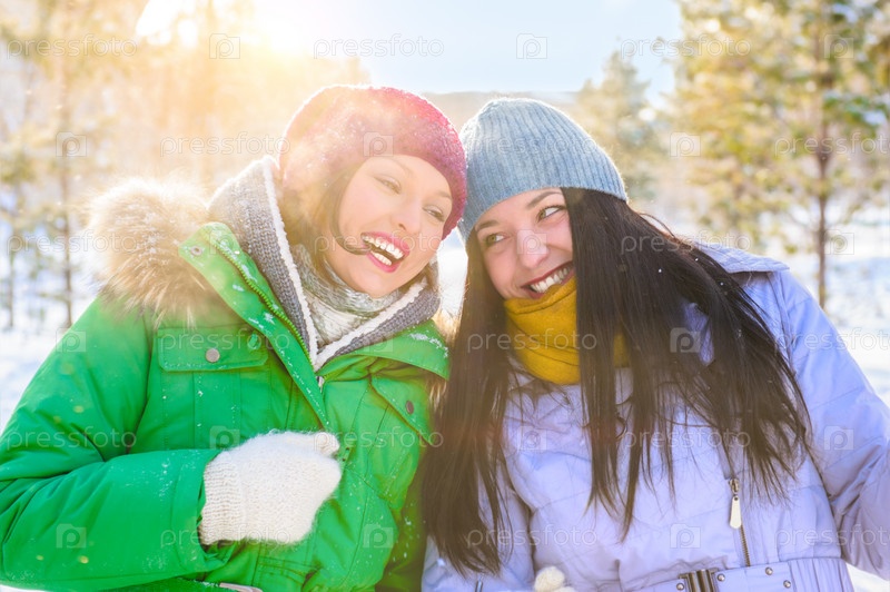 Две счастливые молодые девушки в зимнем парке