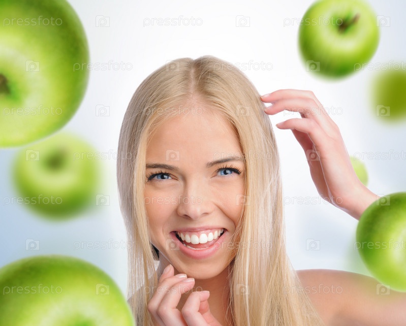 Красивая стройная девушка с зелеными яблоками, падающими вокруг нее