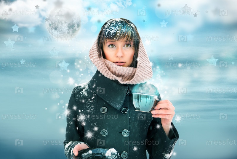 Молодая женщина с чашкой кофе или чая. Снег на голове и плечах