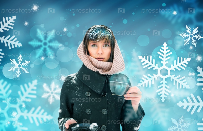 Молодая женщина с чашкой кофе или чая. Снег на голове и плечах