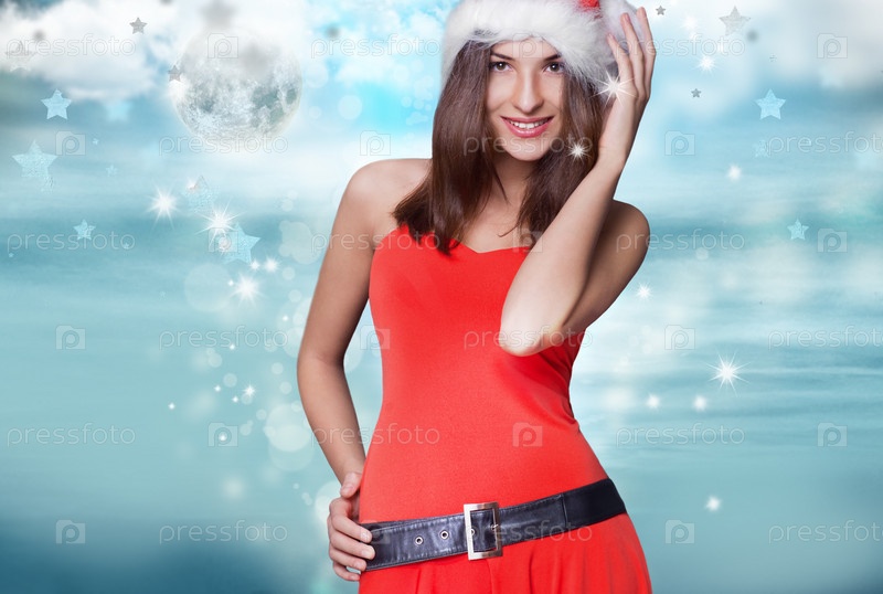 Красивая женщина в Рождественской одежде на зимнем фоне