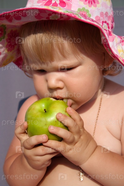 Маленькая недовольная девочка ест яблоко