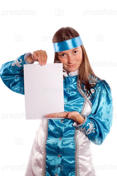 Девушка в синем костюме держит чистый лист