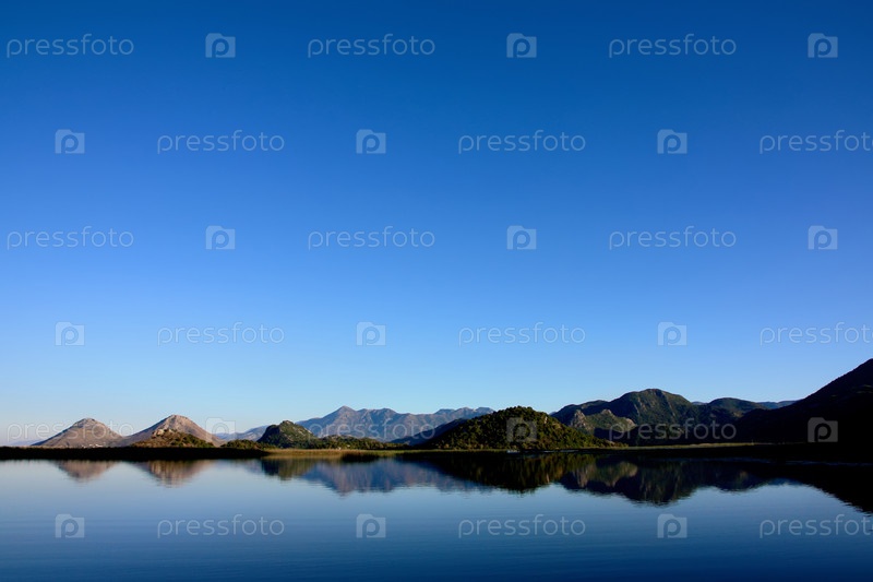 Голубое небо и горы, отражающиеся на поверхности Скадарского озера, Черногория