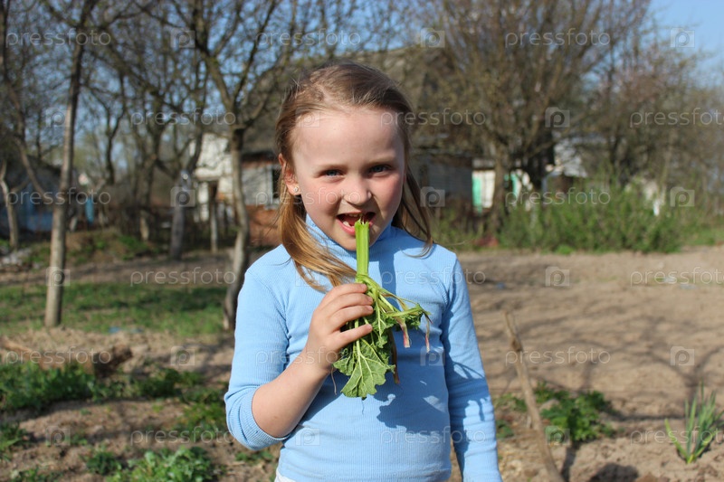 Девочка жует молодой побег ревеня