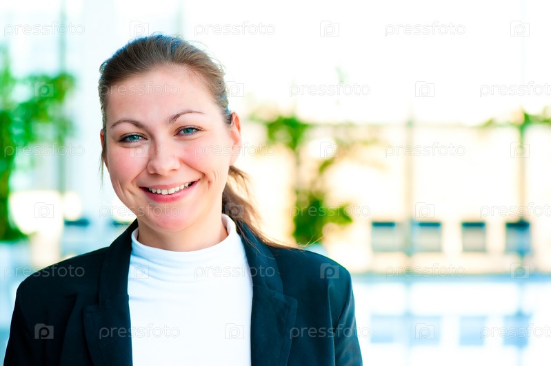 Портрет улыбающейся бизнес-леди на фоне офиса